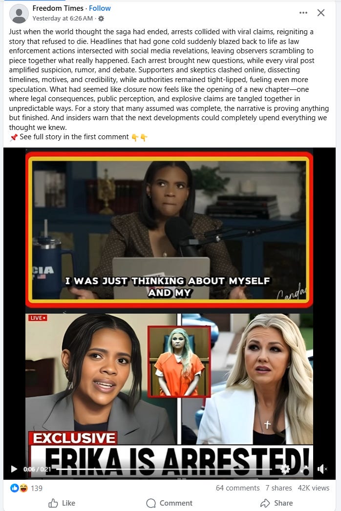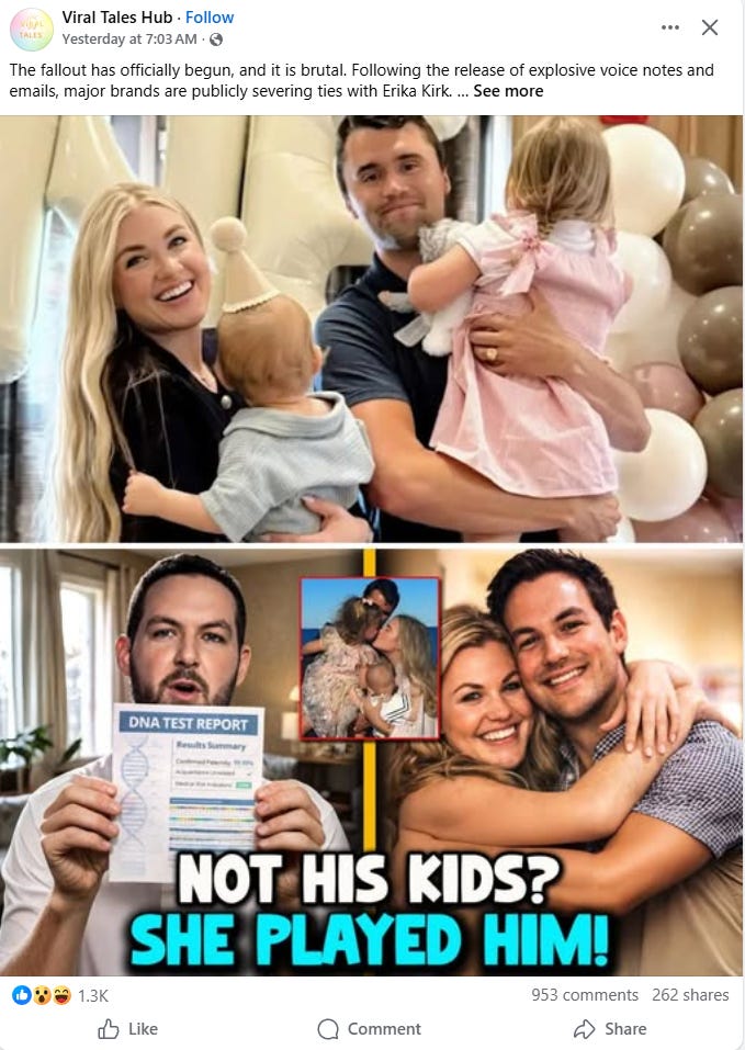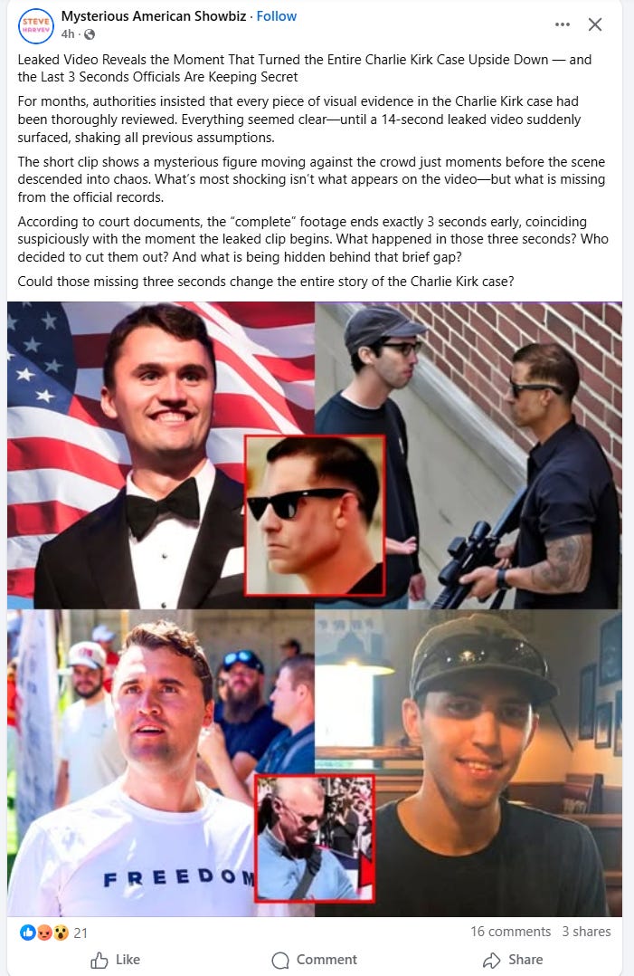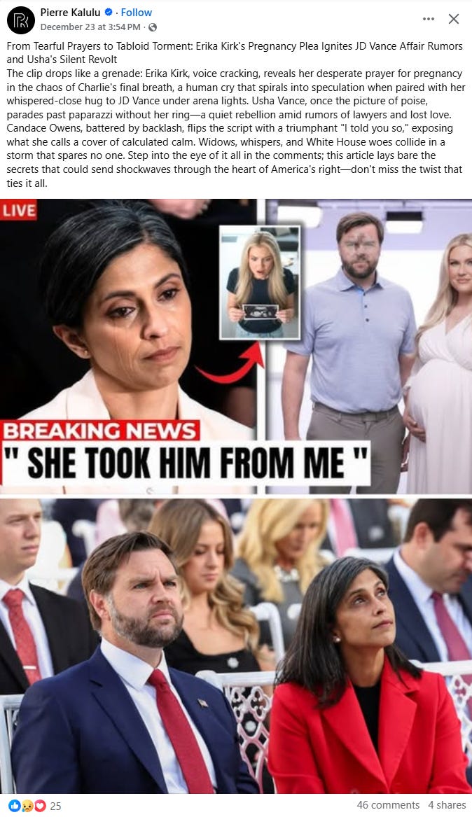 Let us now turn to Facebook, and see what the latest headlines have in store. These are all snapshots from real accounts taken from the day this article was written and published. From this, we can piece together several conspiracy theories that are floating out there. The picture these conspiracies paint is clear: Erika Kirk is less a common widow of a murdered man and more the Biblical Whore of Babylon, who murdered Charlie so that she could be with JD Vance, a corrupted soul bewitched by the guiles of the Whore.