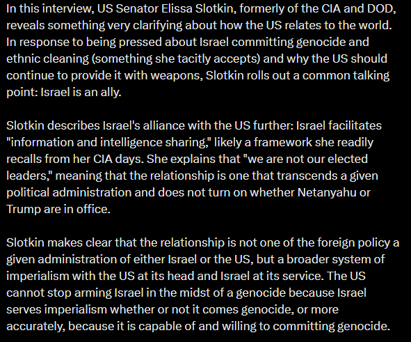It’s important to note this history because people like Michigan Senator Slotkin cannot imagine a future where Israel is not our ally anymore. That type of thinking is frankly wrong and antithetical to actually running an empire, and is doomed to drag us into a world war if we are not careful.